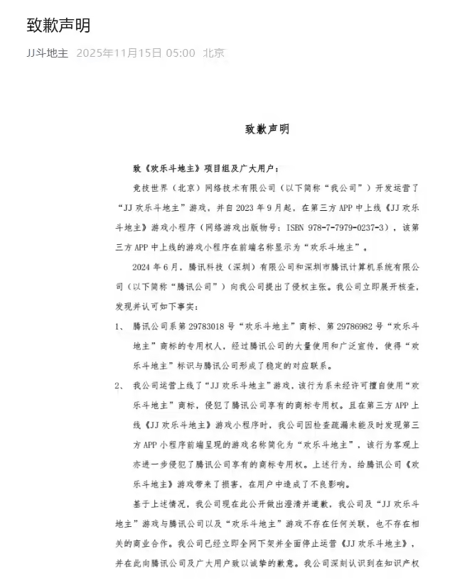 11月15日,《JJ斗地主》开发商竞技世界(北京)网络技术有限公司发布致歉声明。其主要内容如下: