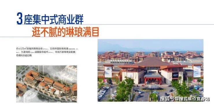 3座集中式商业群 —— 滨海风情商业街距项目约1km、约8km到达九里润街、约8km到达王府井悦舞小镇(原首创奥特莱斯购物中心)