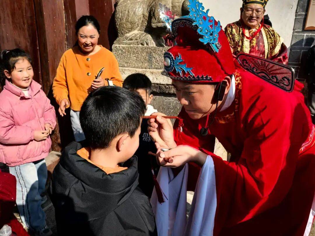最受孩子们青睐的,当属开笔礼中的启蒙描红环节。开笔礼作为古代学童的“破蒙”仪式,如今被赋予了崭新的时代内涵——既让孩子们领略传统文化的独特韵味,也引导他们领悟“先做人、后读书”的道理,更寄托着家长对孩子明事理、爱学习的殷切期望。状元扮演者李艳成身着一袭绯红状元袍,俯身将朱砂轻点在孩子们的眉心,含笑说道:“一点朱砂启智慧,两笔描红学做人,三纸墨香承文脉。”状元,是无数家长与孩子心中成才梦想的象征,李艳成希望通过《状元贺新春》这一场跨越千年的文化对话,让理想在仪式中落地生根,让传承在参与中悄然发生。
