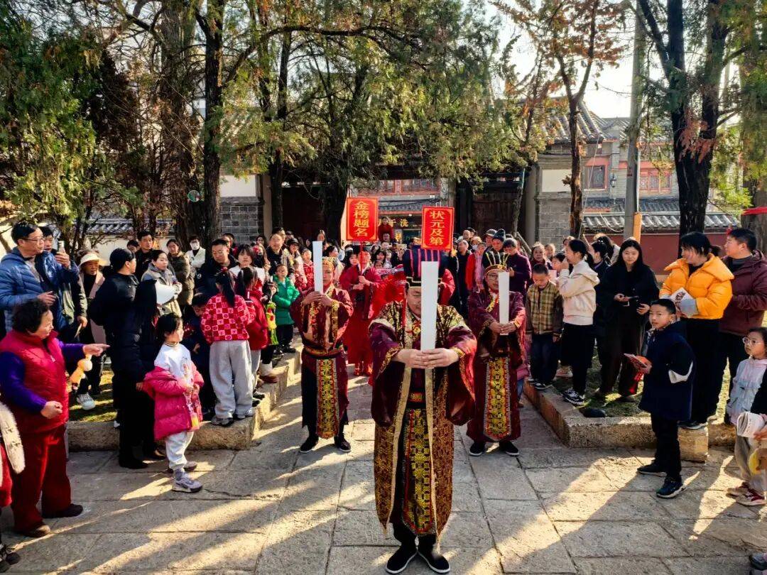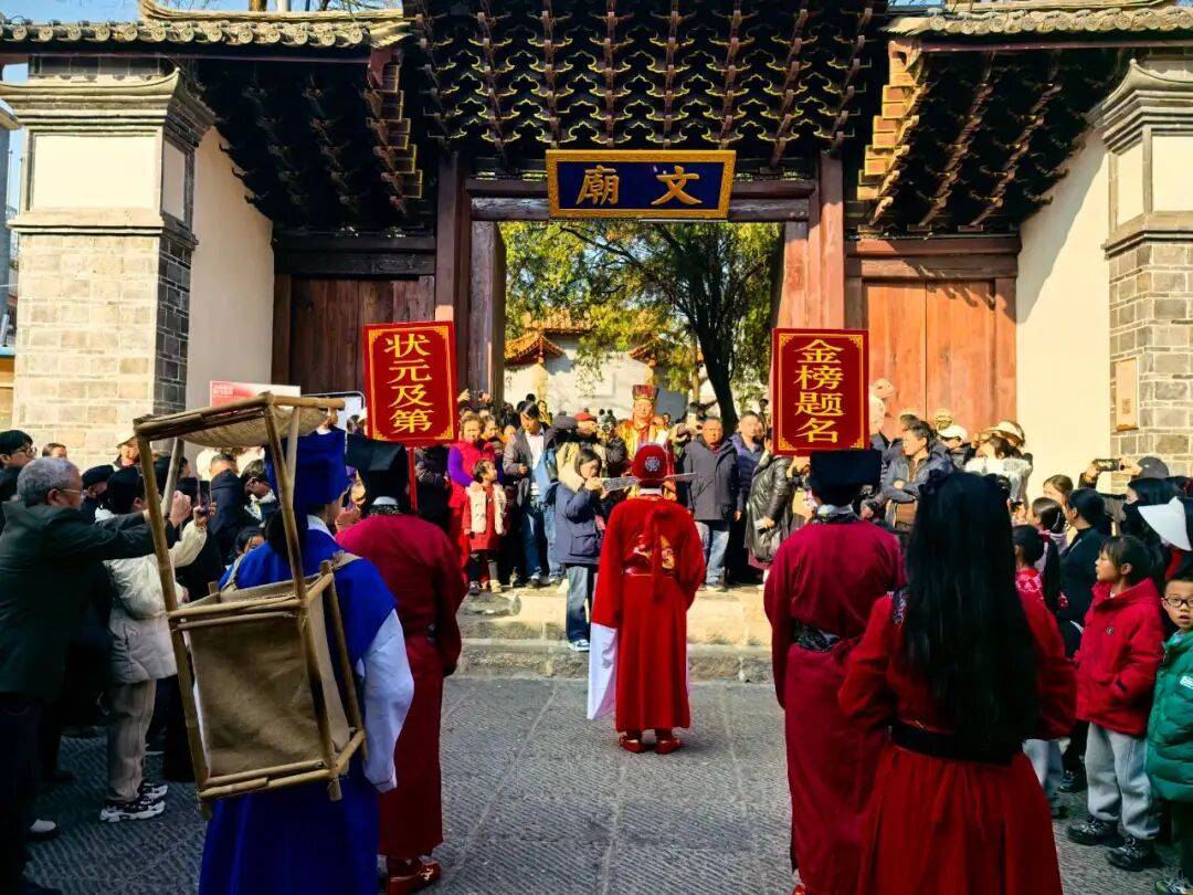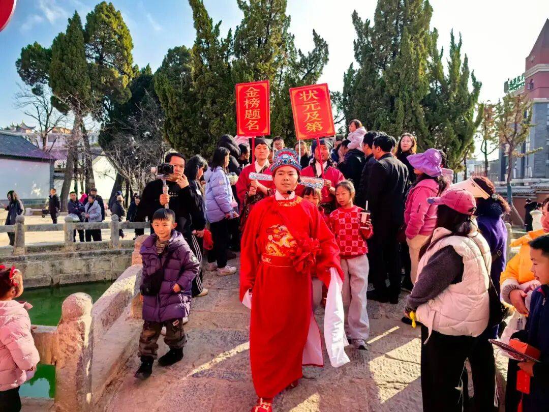 本次《状元贺新春》互动式实景演出,以“金榜题名 荣归故里”为主题,让市民游客既能欣赏精彩的实景演绎,又能亲身参与各类传统文化仪式。活动现场,不少市民带着孩子专程赶来,文庙内人头攒动,处处洋溢着新春的喜庆与文化的雅致。